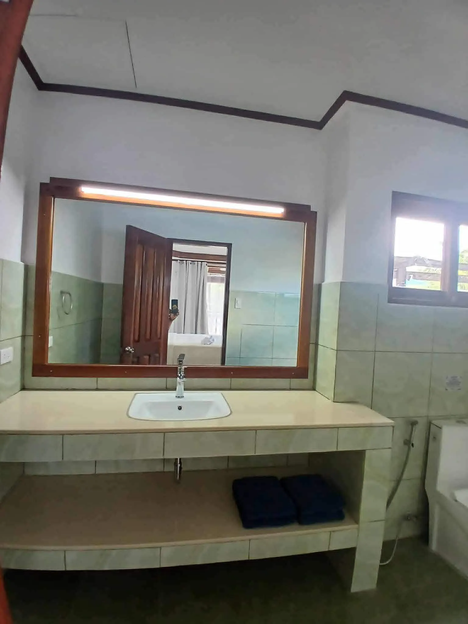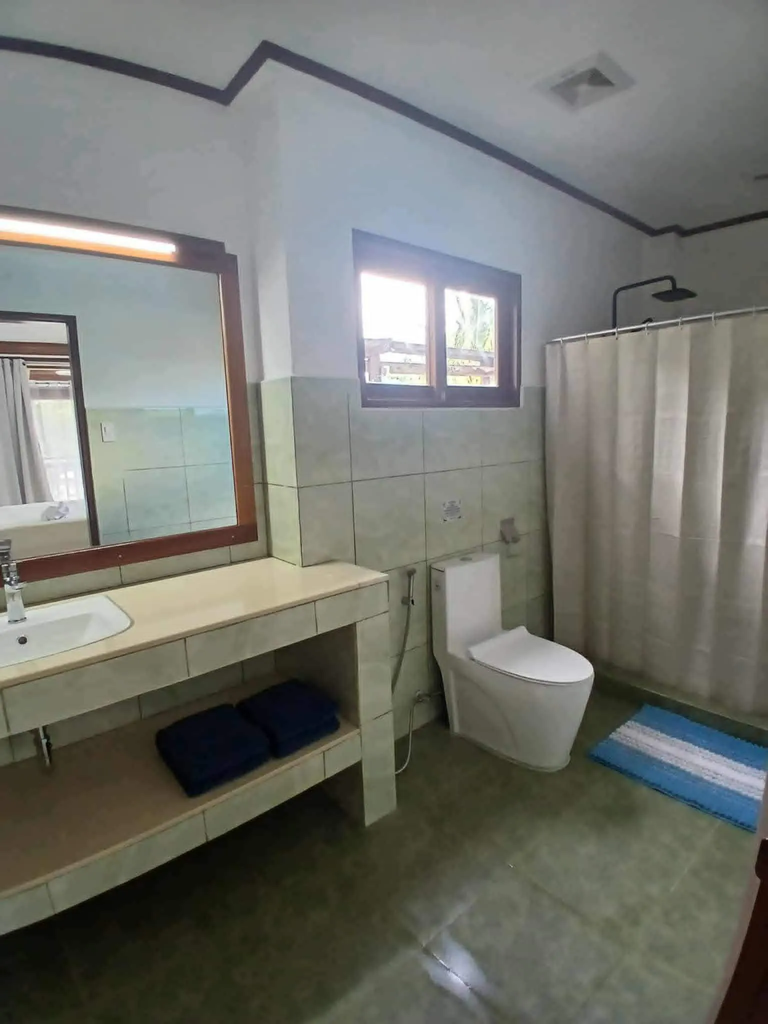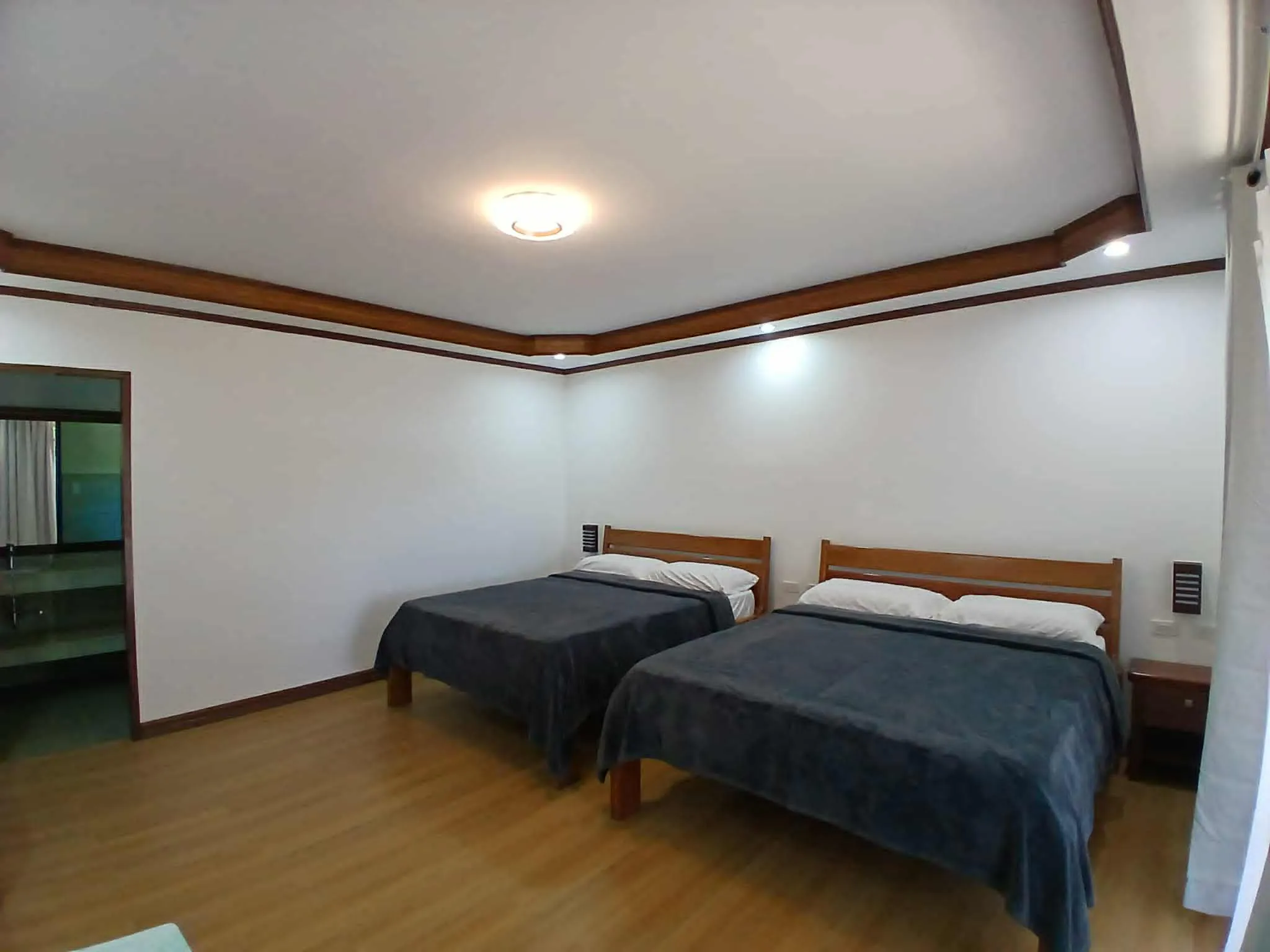 2nd Floor Ocean view Cabana with a Queen and Twin Bed. Amenities include an independent air conditioner, flat-screen TV, refrigerator, microwave, table and chairs, and stand-up closet. Full bathroom with shower and toilet bidet.