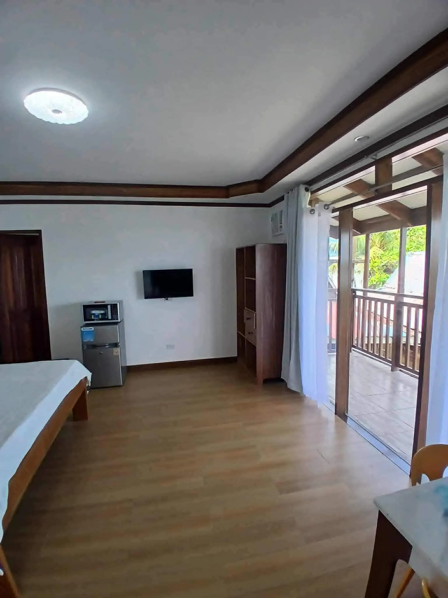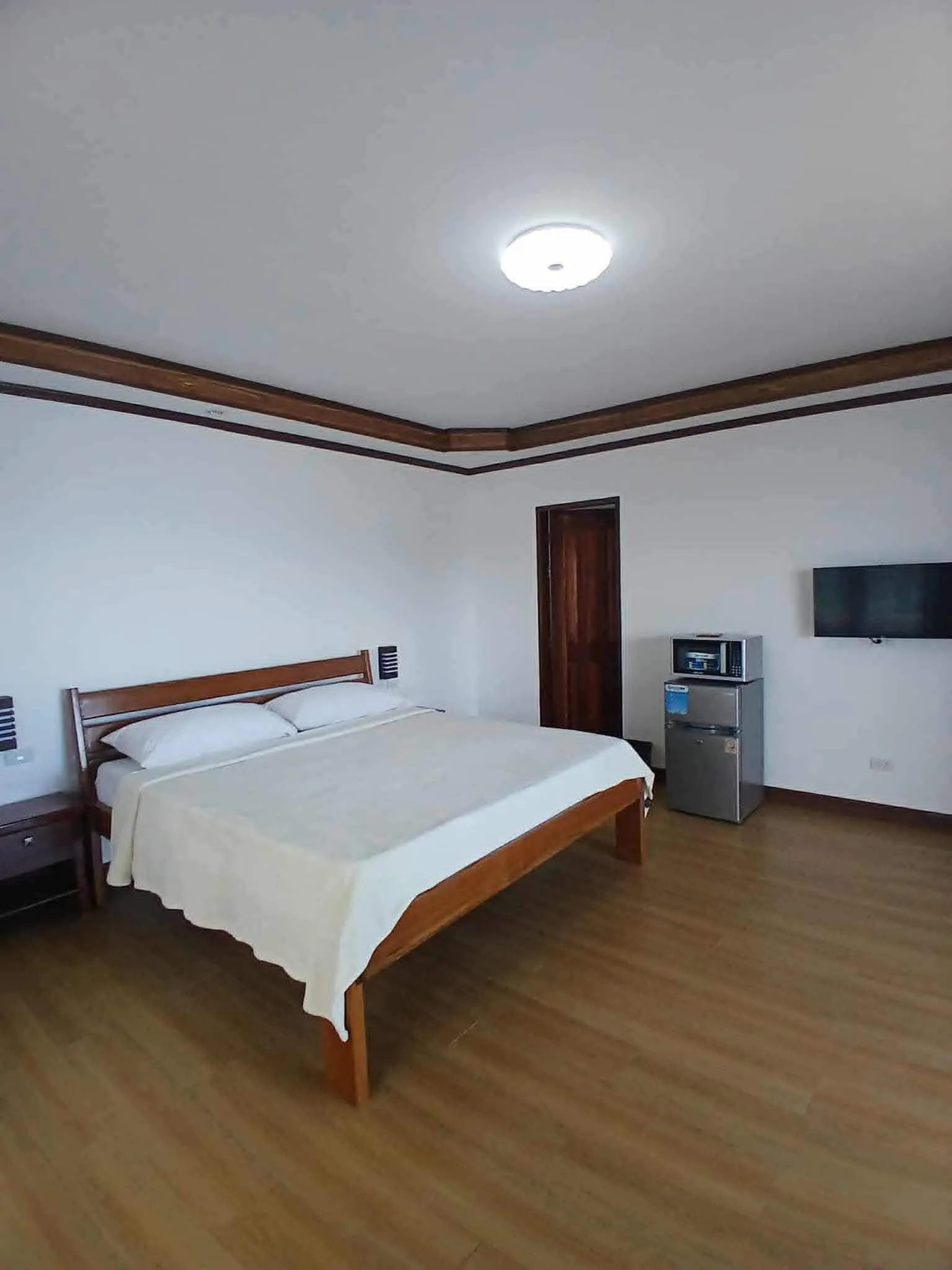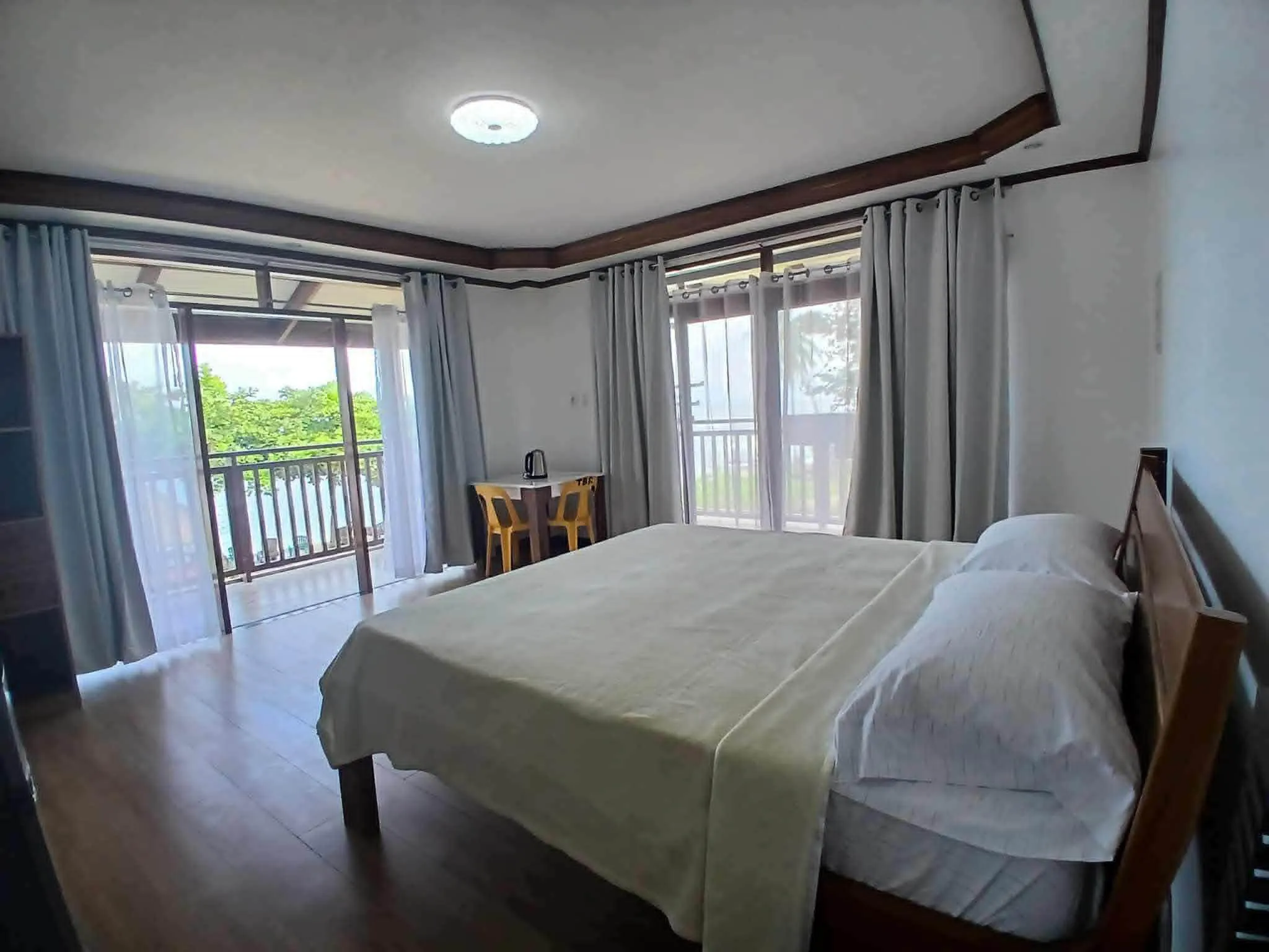 2nd Floor corner Cabana with one King Bed and spectacular ocean view. Amenities include an independent air conditioner, flat-screen TV, refrigerator, microwave, table and chairs, and stand-up closet. Full bathroom with shower and toilet bidet.